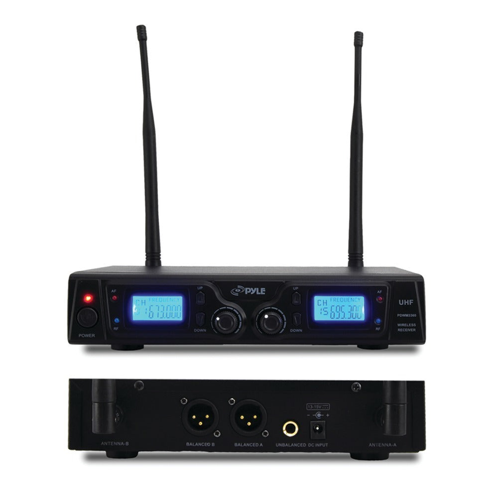 • UHF band receiver system;• Up to 16-channel frequency design;• PLL-synthesized control technique;• Double noise-squelch operation circuitry;• Up to 165ft wireless communication range;• Broad frequency response range & low distortion;• Integrated noise filtration system;• High signal/noise ratio performance;• AF & RF signal LED indicators;• Independent channel adjustable volume controls;• LCD digital display with channel & frequency readout;• Easy-to-use button control;• Detachable dual antennas;• Rack-mountable system;• 1/4 XLR unbalanced audio output connector;• 2 mixed balanced output connectors; HEIGHT X LENGTH X WIDTH: 3.75 X 7.25 X 14.5 WARRANTY: ONE YEAR RETURNABLE: Yes